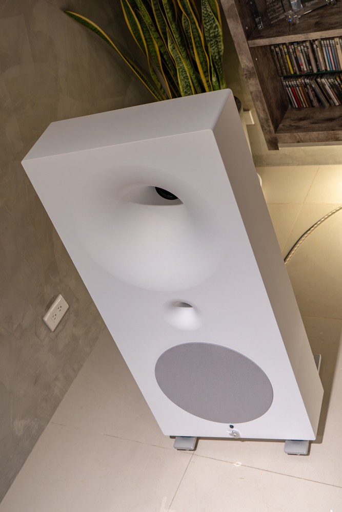 不像自家较高阶的 Uno、Duo 和 Trio,均使用压铸成型的音箱花状圆形号角。Zero 这个型号为一体式设计,不仅三音路音箱、低音模块都装在一个音箱里,这个以 PUR 聚胺酯铸造成型的箱体,高音和中音处为一体成型的号角开口。Zero iTRON 音箱自带仰角,过去 Zero 1 的仰角固定,如今 Zero iTRON 的后脚钉可调高低,透过改变后脚钉高度,即可改变 Zero iTRON 仰角。仰角调整,则和我们座位的距离,以及我们想听清楚多少细节有关。