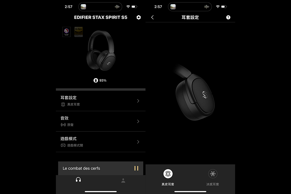 Edifier Stax Spirit S5 适用于新的 Edifier App。在手机上下载 Edifier ConneX,除了可以设定一些功能,还有 EQ 模式可connect选。新的 Edifier ConneX 界面和之前的 App Edifier Connect 不太一样,Stax Spirit S5 只能使用于新的 Edifier CooneX。进入 App 之后,主页面上可以进行「耳套设定」、「音效」(即 EQ)、「游戏模式」的设定。如果更换用「冰感耳罩」,针对耳罩材料的特性,原厂做出一些 EQ 的补偿。游戏模式简单而言就是低延迟开启与否的选择,如果你是听音乐,不需要低延迟,可以关闭这个功能,音质会好一点。