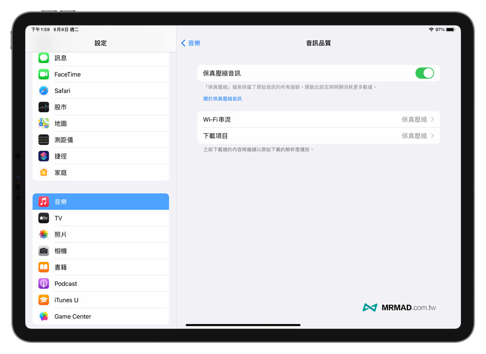 4.在音乐播放品质,将「保真压缩音讯」开启,就可以选择串流传输和下载音乐的品质: