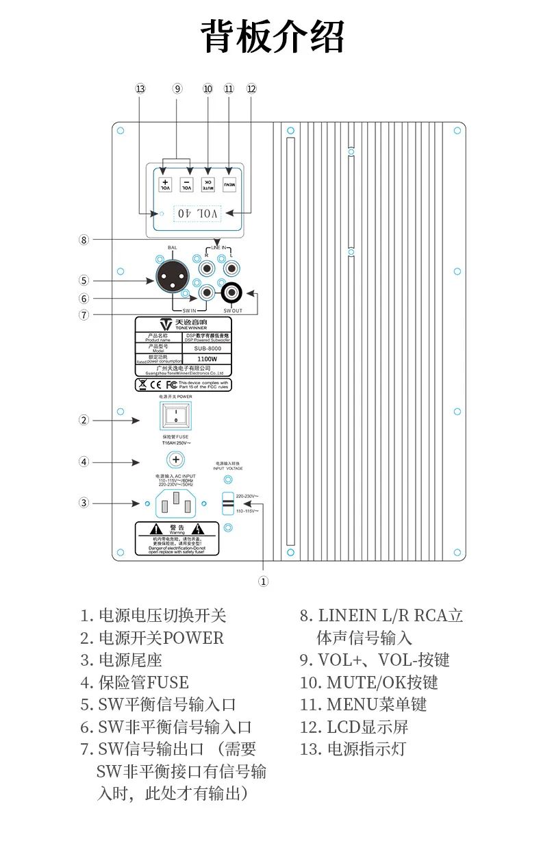 1. 采有高效低噪D类放大电路内置DSP数字处理器,7段参量均衡(EQ) 任意调节