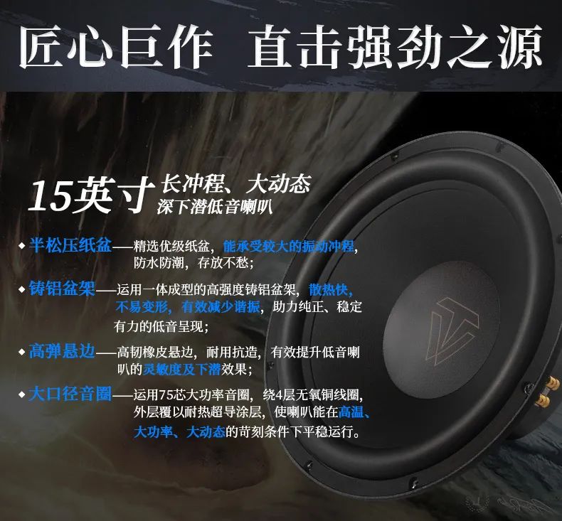 2. 双15英寸、长冲程、强磁、大功率喇叭单元,具有低失真、高动态长冲程等特点;