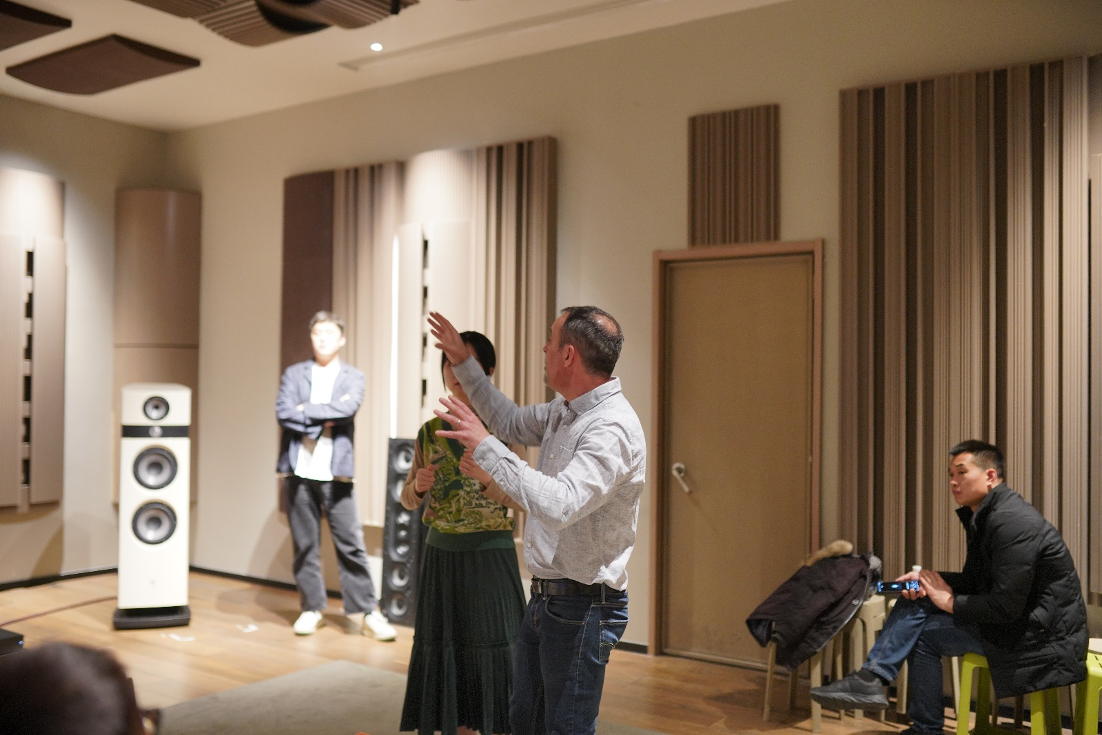 下午的时候所有的选员分成两队。分别在两个不同的区域。根据Nicolas先生秘授的调试方法,一步一步地对扬声器地摆位进行调整调试。在场的每个学员都认真尝试了这套调音秘籍。经过这一个下午的实践操作,再加上Nicolas先生时不时的指导和调整。都分别调整出了令人拍案叫绝的现场效果。