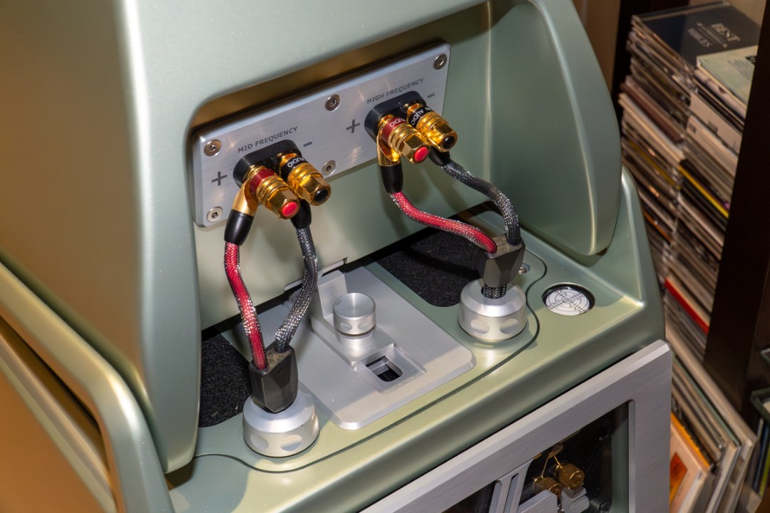 过去 Wilson Audio 爱用美国 Transparent 机内配线,不过到了 Sasha V,采用自家研发的 V-Cable,而且换上新的订做端子,Wilson Audio 只说是纯度很高的金属材料,没有把细节讲得很清楚,但是 Sasha V 新的音箱端子,实用性提高,可以对应香蕉插,以前 Wilson Audio 的音箱端子,只能用 Y 插,现在新的订做音箱端子,也可以用香蕉插了。